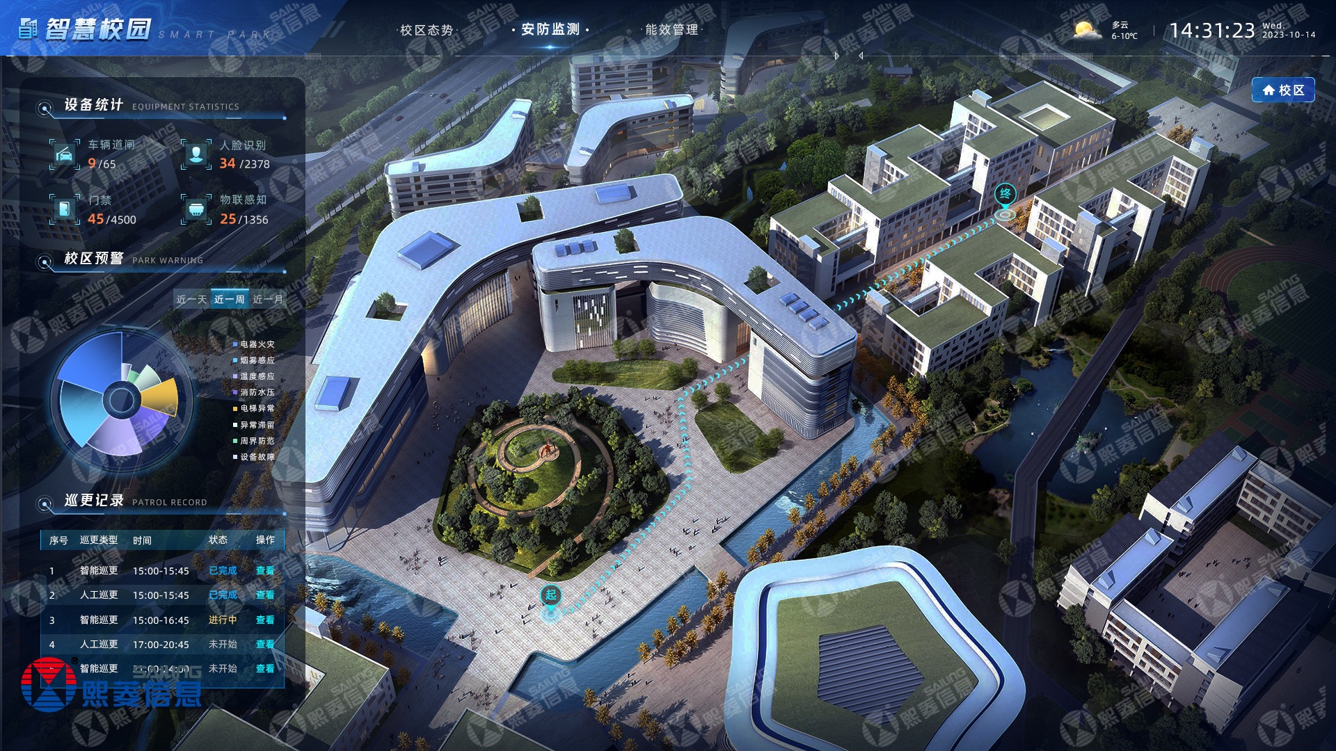 聚焦业务应用,根据当下全国数字新基建实际情况,结合多地政策关于IOC基础应用平台功能建设要点,壹定发信息的智慧校园数字孪生综合管理平台主要围绕区域态势、决策分析、应急指挥三模块集成并丰富应用功能。